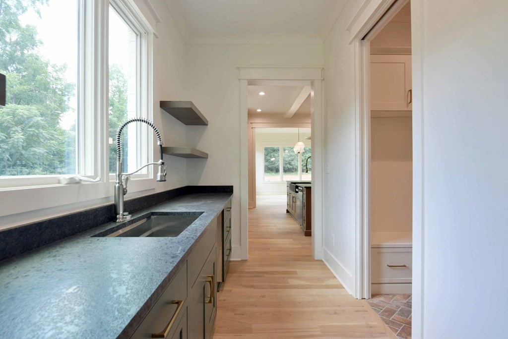 3) Scullery/pantry with tons of cabinets and floating shelves