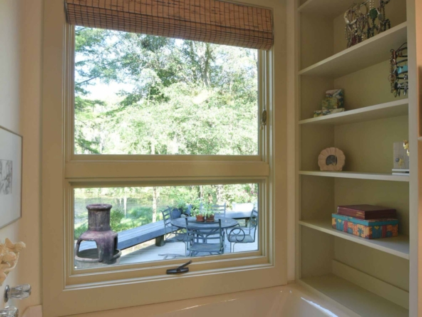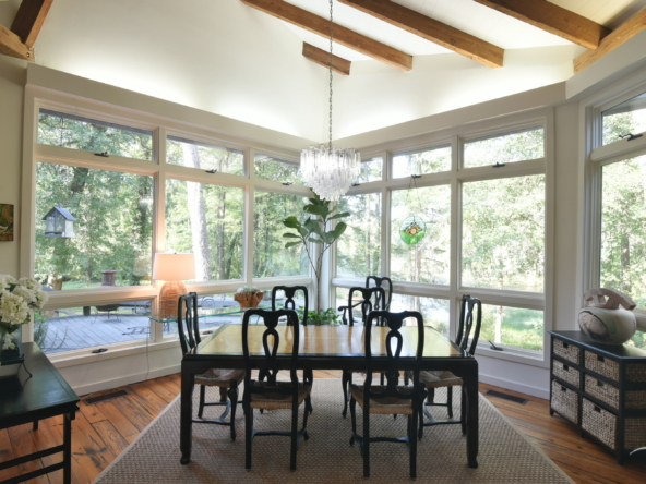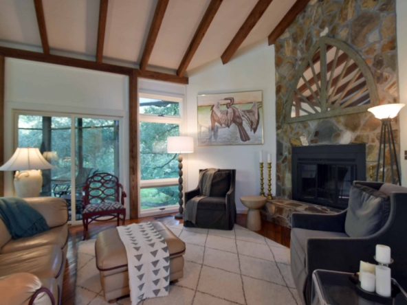This thoughtfully designed 3-bedroom, 2.5-bathroom home features an open floor plan with soaring ceilings, reclaimed pine floors, and custom finishes throughout. The great room is anchored by a striking stone wood burning fireplace and highlighted by floor-to-ceiling windows that frame picturesque views of the creek and surrounding landscape. Reclaimed beams from a local cotton mill accent the vaulted ceilings, adding character and charm to the space.