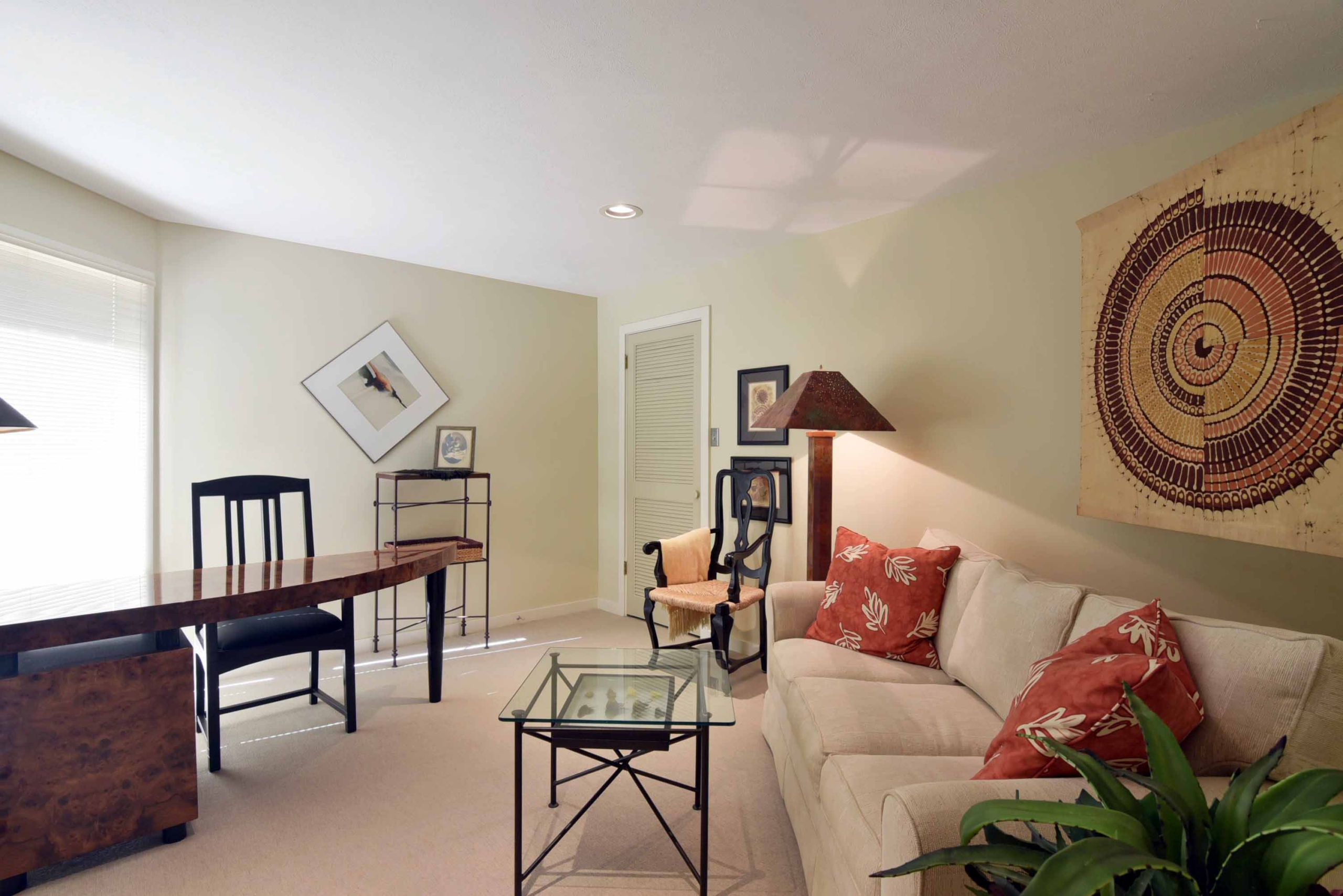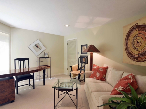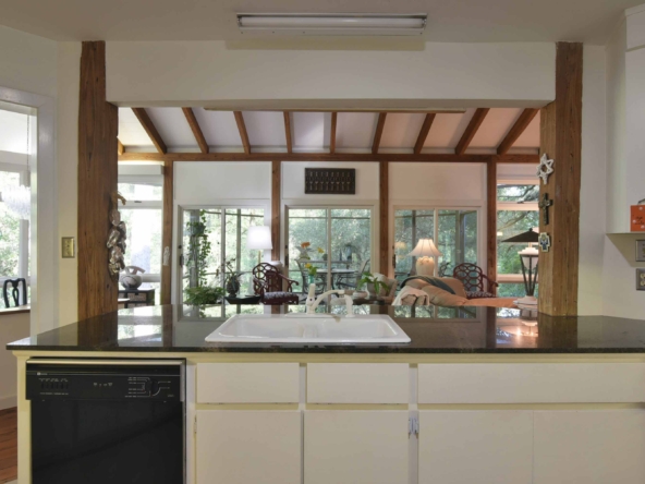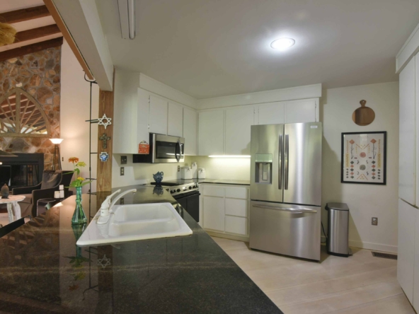 Just off the great room is the open dining area, offering a perfect space to entertain while overlooking the backyard and creek. The adjacent kitchen is a chef’s dream with granite countertops, a pantry, and bar seating. A cozy den sits nearby, with large windows that invite the outdoors in and provide easy access to the raised back deck.