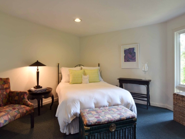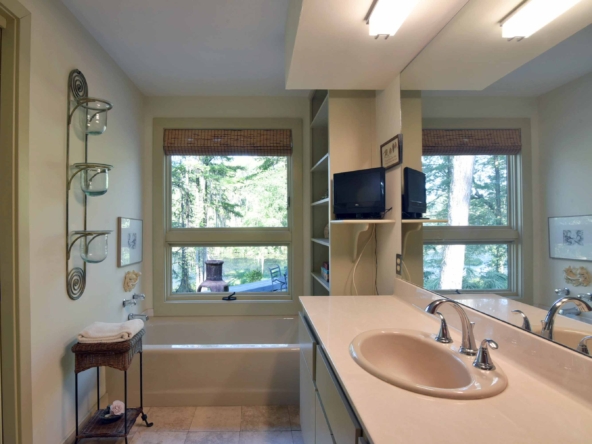 The spacious primary bedroom suite boasts vaulted ceilings, a private fireplace, and expansive windows that offer a tranquil view of the surroundings. The en-suite bath, complete with a soaking tub, provides the ultimate in relaxation with its picturesque view of nature. Two additional guest bedrooms, each with unique angled walls, share a full bathroom, while a half-bath serves guests. The mudroom, complete with an additional shower, provides ample storage and convenient laundry access.